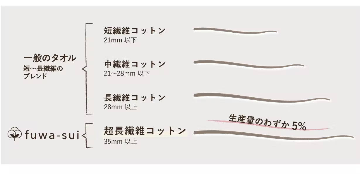 コットンの長さ=繊維の切れ目がタオルになったときに減る為、滑らかな仕上がりになります。