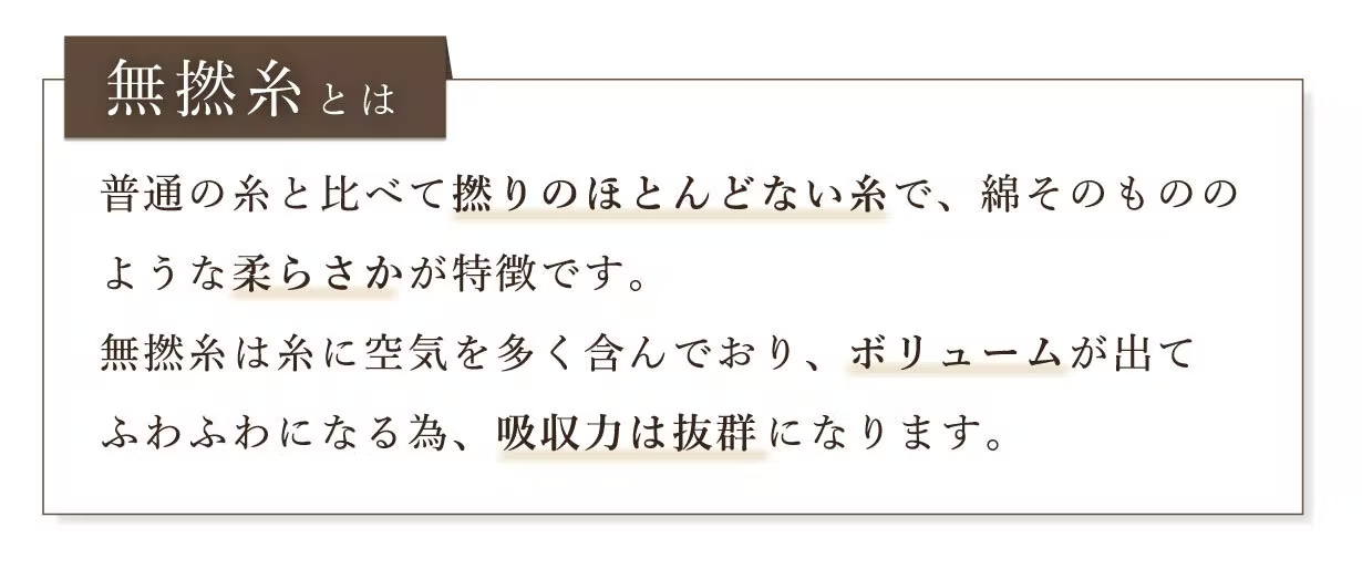 撚らない事で、空気を含んだふわふわなタオルに仕上がっています。