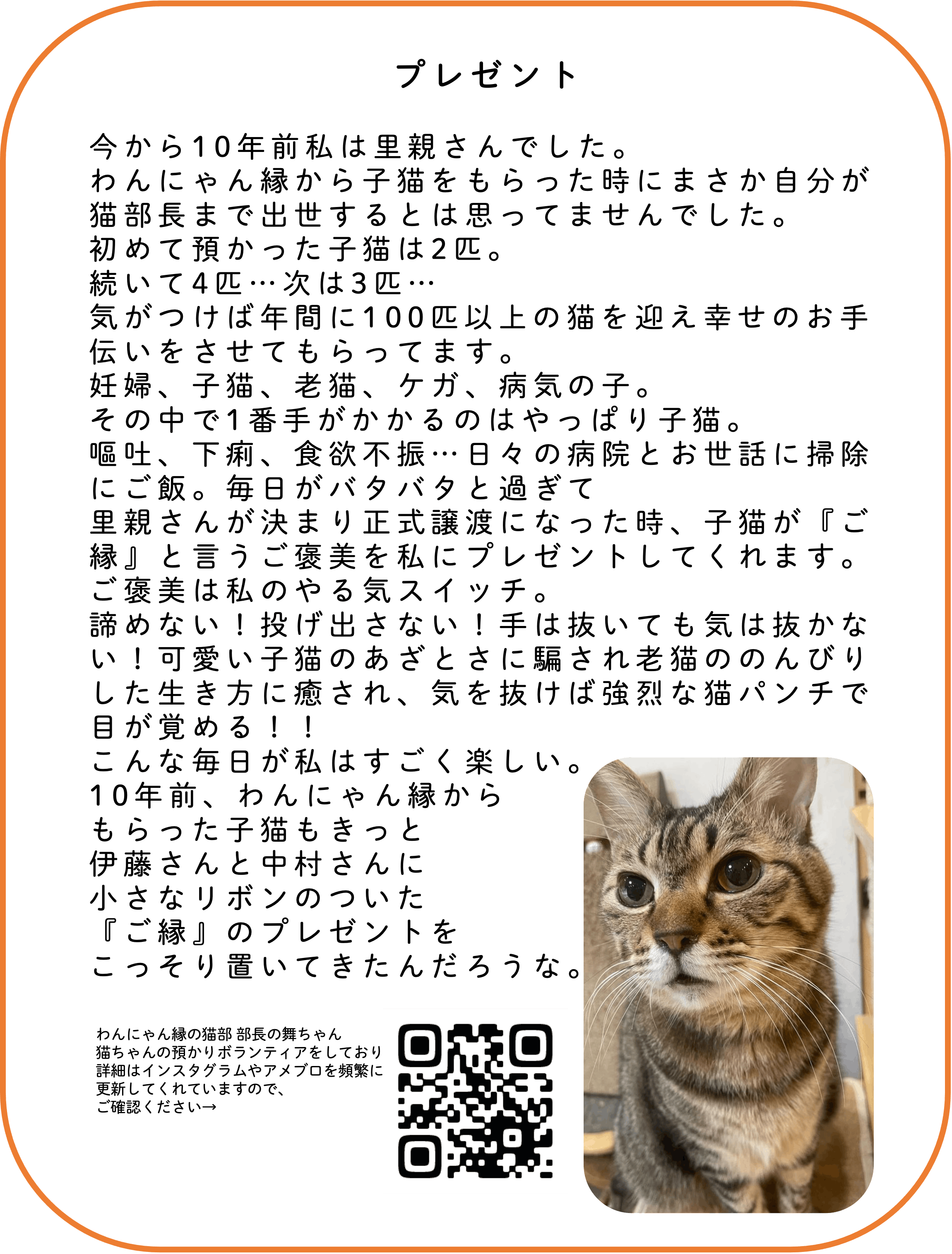 ・えにしより、感謝のメールをお送りさせて頂きます。メールには猫ちゃんの写真を2枚つけてお送りします。