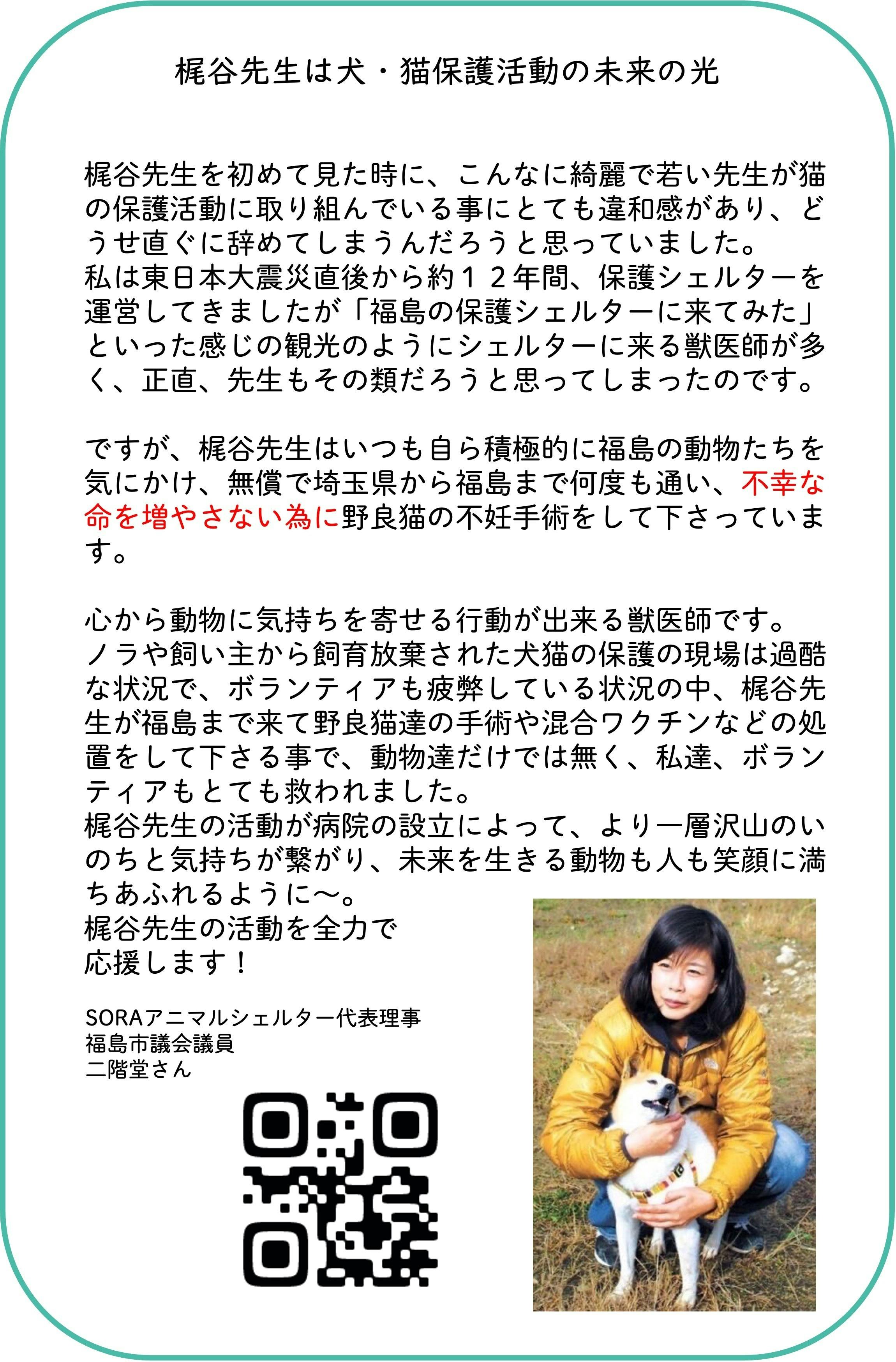 これはどのボランティア団体も同様のことだと思いますので、この“えにし動物病院”の設立は活動の光になると思います。