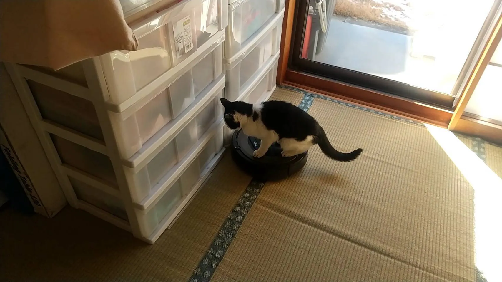 動画の掲載ができないのが残念ですが、いつも大好きなルンバに乗っていつまでもスイッチを切るまで、家の中を散歩しているんです。