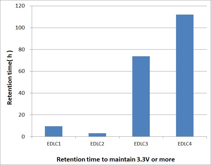 上の図の通りなのですが、4つの電気二重層キャパシタでは、3.3V以上の電圧を保持する時間が全く違います。