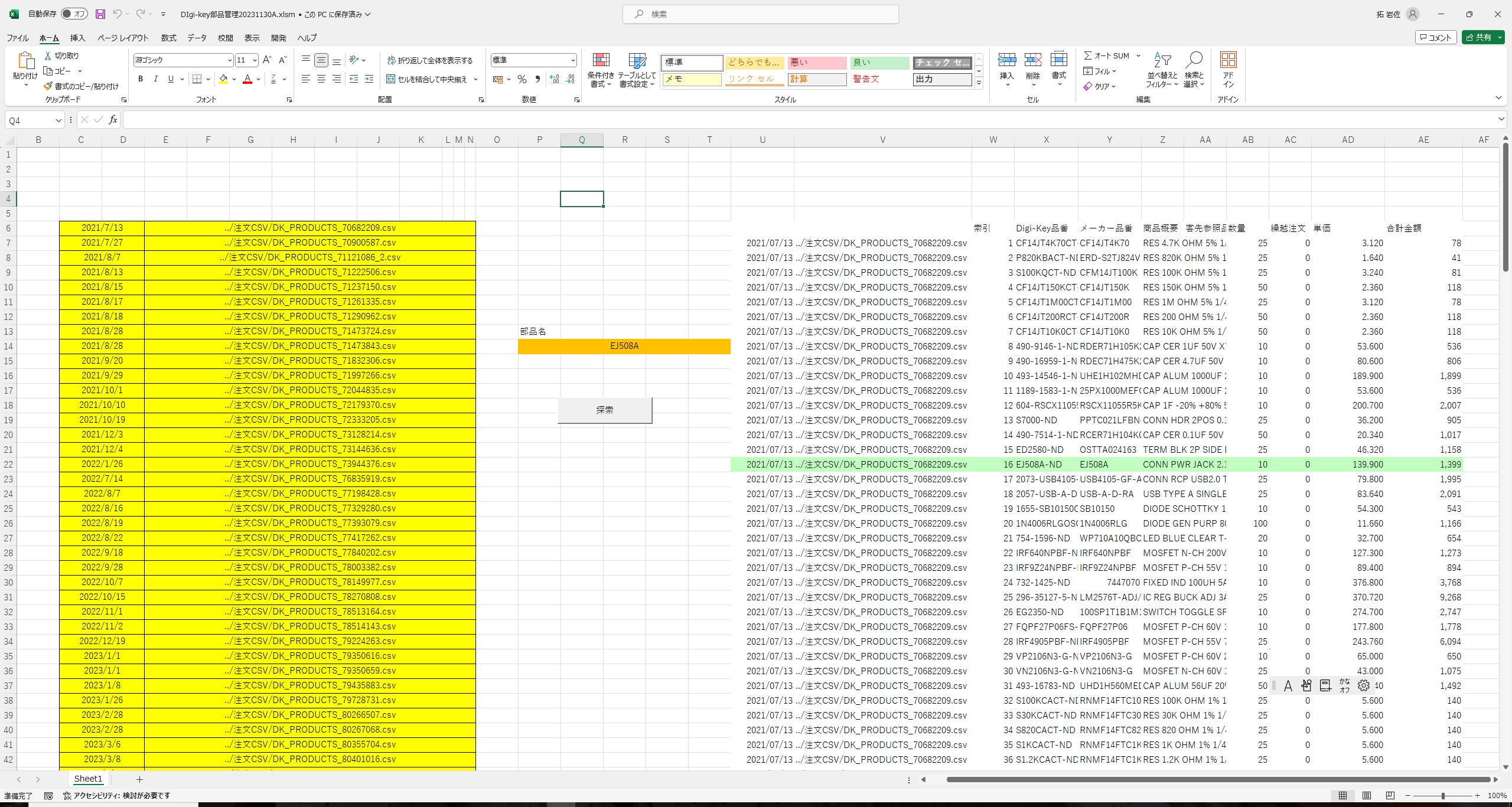 digi-keyの数十件の納品一覧CSVから、全項目の一覧を作り、検索対象の型番一致でハイライトするEXCELマクロを作りました。