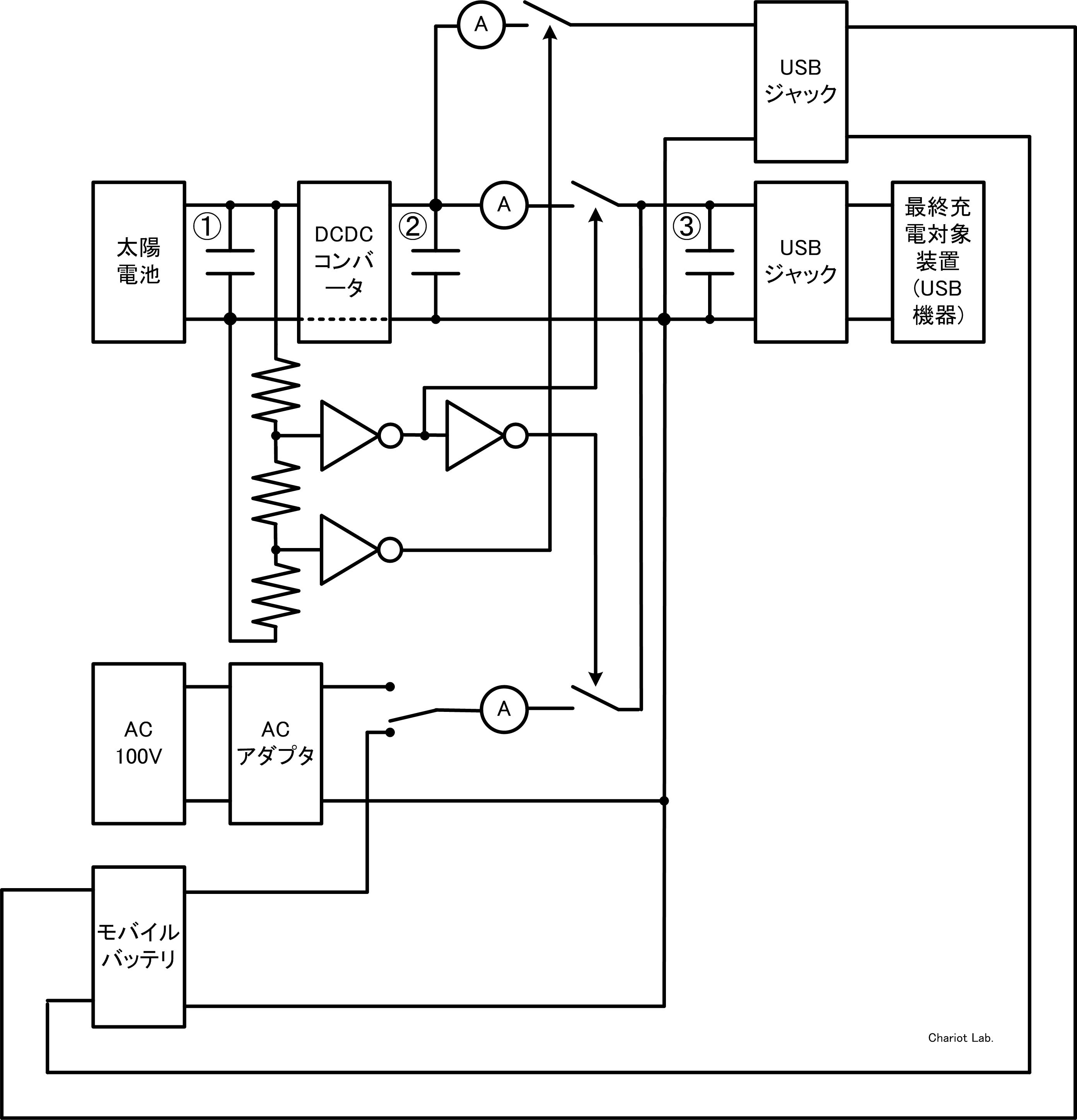 <訂正版> 大変申し訳ありません。 本日昼に投稿した活動報告で、回路図に誤りがありましたので訂正いたします。 電子メールで活動報告を受け取られた方は、昼の分を削除いただけますでしょうか。 みなさんこんにちは。今週中に支援が入らなかった場合、しばらく活動報告を書くのを中止します。逆に今週中に重要な活動報告はすべて出ますので、見逃さないでください。特に、今回の活動報告は、おそらくすべての活動報告の中で最も重要になります。今回は、Chariot SAMBAにおける協調充電について書きます。プロジェクトページにも技術的説明として協調充電について書きましたが、Chariot SAMBAにおける3段階判定については触れていませんでした。プロジェクトページでは、いきなりChariot SAMBAにおける3段階判定について書くと難しいかと思ったのであえて一般的な協調充電についてのみ書きました。この活動報告では、Chariot SAMBAにおける3段階判定について書きます。 Chariot SAMBAでは、抵抗分割により太陽電池からの入力電圧を3段階に判定します。1.14.5V未満2.14.5V~16.5V3.16.5V以上1.太陽電池からの入力電圧が14.5V未満 のときは、モバイルバッテリーから最終充電対象装置の系統をオンし、太陽電池から最終充電対象装置の系統をオフし、太陽電池からモバイルバッテリーの系統をオフします。2.太陽電池からの入力電圧が14.5V~16.5V のときは、モバイルバッテリーから最終充電対象装置の系統をオフし、太陽電池から最終充電対象装置の系統をオンし、太陽電池からモバイルバッテリーの系統をオフします。3.太陽電池からの入力電圧が16.5V以上 のときは、モバイルバッテリーから最終充電対象装置の系統をオフし、太陽電池から最終充電対象装置の系統をオンし、太陽電池からモバイルバッテリーの系統をオンします。 太陽電池からの電力がある強さの時には、1の状態になったら電力が余り、その結果2の状態になり、2の状態になったら電力が足りなくなり、その結果1の状態になります。 このフィードバックにより、太陽電池からの入力電圧が14.5V付近になり、太陽電池から最終充電対象装置の系統を流れる電流が第1のある値で釣り合います。 第1のある値は、太陽電池の発電量によって変わってきます。 太陽電池からの電力がより強いある強さの時には、2の状態になったら電力が余り、その結果3の状態になり、3の状態になったら電力が足りなくなり、その結果2の状態になります。 このフィードバックにより、太陽電池からの入力電圧が16.5V付近になり、太陽電池からモバイルバッテリーの系統を流れる電流が第2のある値で釣りあります。 第2のある値は、太陽電池の発電量によって変わってきます。 この3段階の判定により、このような電力のやり取りとなり、太陽電池からの発電電力が弱い場合、太陽電池とモバイルバッテリーが協調して最終充電対象装置に充電する協調充電となり、太陽電池からの発電電力が強い場合、最終充電対象装置をフルパワーで充電し、さらに余った電力をモバイルバッテリーに充電します。 いかがでしたか?この活動報告が、Chariot SAMBAのコアとなる技術になります。次の活動報告では、これらの3段階の判定ごとのモードについて説明します。また明日お会いしましょう。