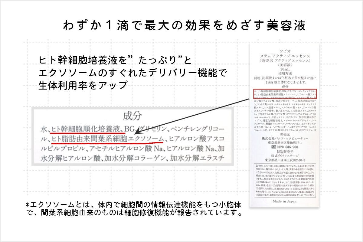 2014年、ヒト幹細胞美容液「ワビオ ステム アクティブ エッセンス」を発売しました。以後、日進月歩で進化する再生医療テクノロジーやお客さまの声を取り入れながら、今実現できる最高のヒト幹細胞美容をお届けする専門ブランドをめざしています。