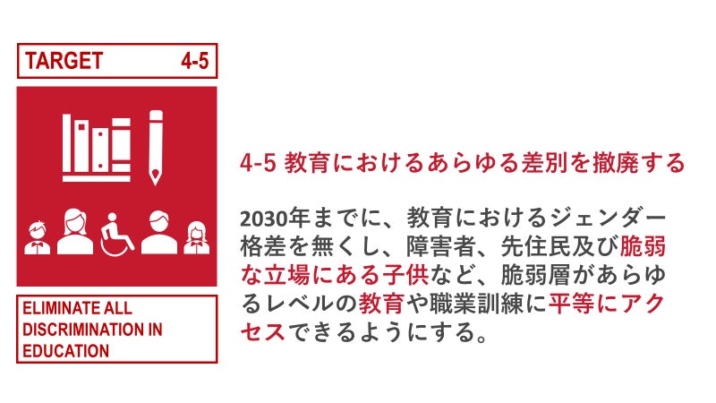 国連の「持続可能な開発目標(SDGs)」では、第4のターゲットとして「だれもが公平に、良い教育を受けられるように学習の機会を広めよう」という目標が定められています(ユニセフによる解説はこちら)。そして、ターゲット4-5では、2030年までに「教育におけるあらゆる差別を撤廃する」ことを目指しています。