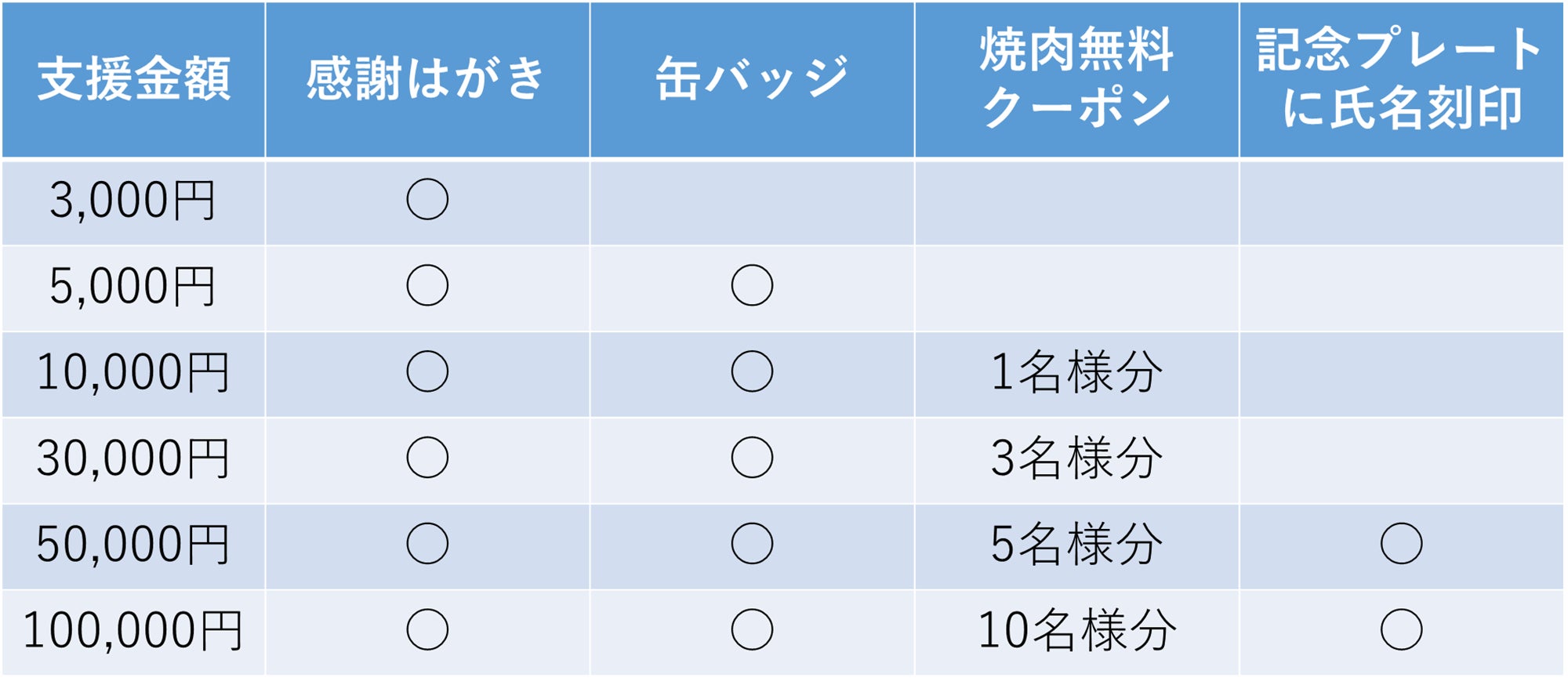 ご支援いただいた方にはささやかながらお礼をさせていただく予定となっています。リターンは「感謝はがき」と「缶バッジ」、「焼肉無料クーポン」、「記念プレートに氏名刻印」があり、支援金額によってお礼の内容が異なります。今回の目玉リターンである「缶バッジ」と「焼肉無料クーポン」については「活動報告」にて紹介させていただきました。リンクをご参照ください。