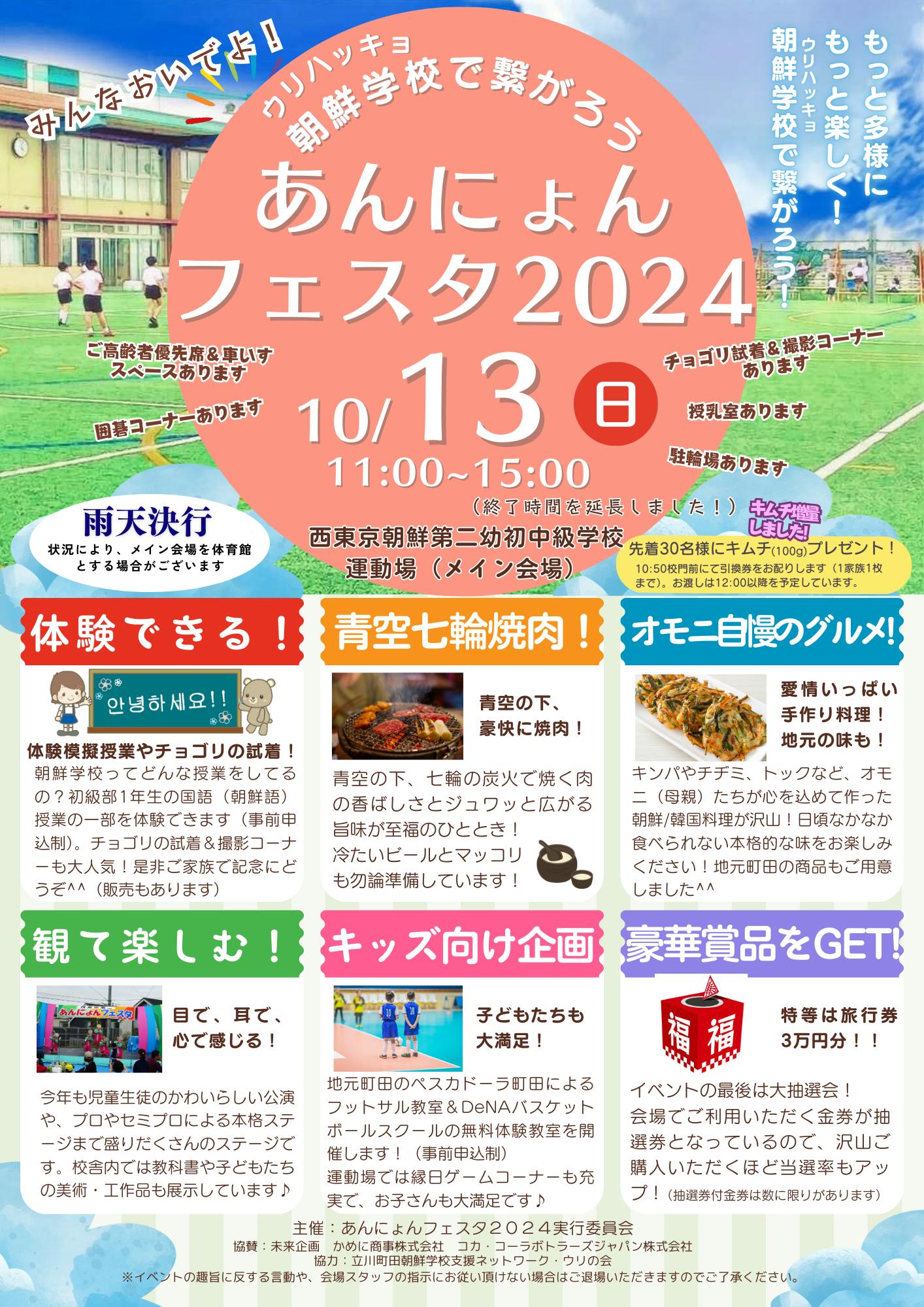 2024/09/28 16:10みなさま、こんにちは。10/13(日)に開催されます『あんにょんフェスタ2024』の詳細が決まってきましたので、改めてご案内いたします。【日時】10月13日(日)11:00〜15:00【場所】西東京朝鮮第二幼初中級学校 運動場(メイン会場)【内容】朝鮮/韓国料理(焼肉やチヂミなど)や児童生徒やプロミュージシャンによる公演、朝鮮学校体験模擬授業(事前申込制)等今回のフェスタは、「朝鮮学校で繋がろう」をテーマに、新たな試みもたくさんしています。いくつか目玉をご紹介いたします。〇今回初めて、国語の授業体験を企画したりチョゴリ試着できるようにしてました。〇朝鮮学校の子どもたちの感性を感じていただこうと、子どもたちの工作品や美術作品も展示されます〇地域の名店の協賛品も販売されます。これはオモニたちを中心に地域の名店を訪ねて回りご協力をいただいているものです。あのパンやらこの手羽先やら、町田や成瀬のお店の定番商品が朝鮮学校で買えます。〇運動会で大変好評だった自家製レモネード&レモンスカッシュも販売します。〇タンフル(フルーツ飴)も販売します。果物がパリパリの飴でコーティングされ、食感も楽しくとてもおいしいです。ぜひ皆様お誘いのうえ、ご参加していただけると嬉しいです。 もっと見るあんにょんフェスタ2024のご案内