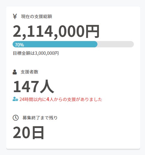皆さまのご支援、応援の中で行われてきました当プロジェクトですが、ついに目標金額の70%を突破し、残すところ20日になりました。事務局一同、最後まで頑張っていきたいと思います。引き続き、ご関心のほど、よろしくお願いいたします。