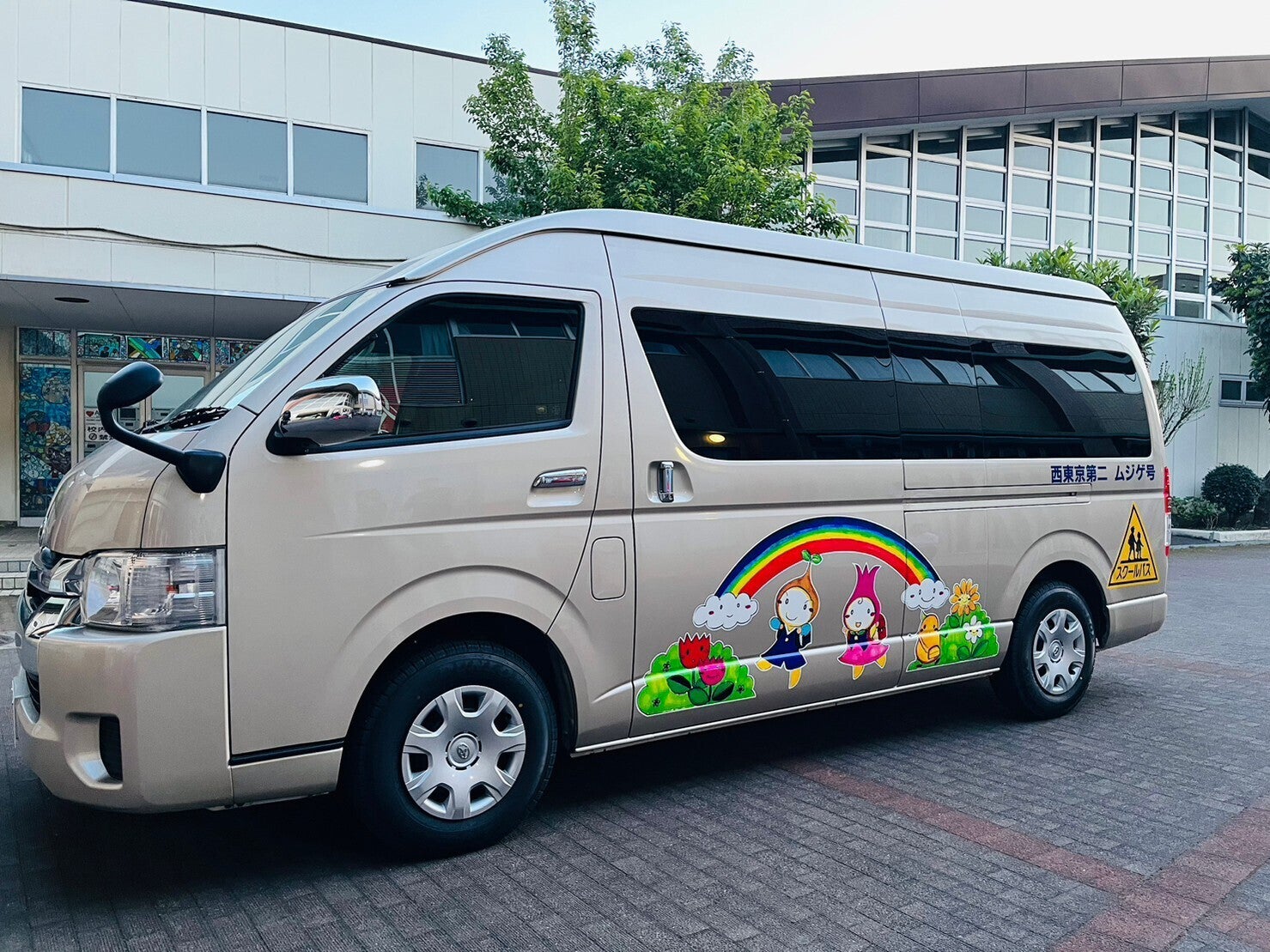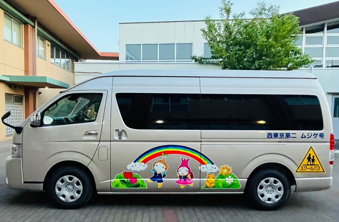 側面には「ムジゲ(虹)とウリウリコッポンオリ」の素敵すぎるイラスト。子どもたちが乗っていることが一目でわかるように。ウリウリコッポンオリは版権元と創始者の許諾を得て、美術のパク・ミオ先生に描いていただきました。そして「西東京第二 ムジゲ号」の文字とスクールバス表示。