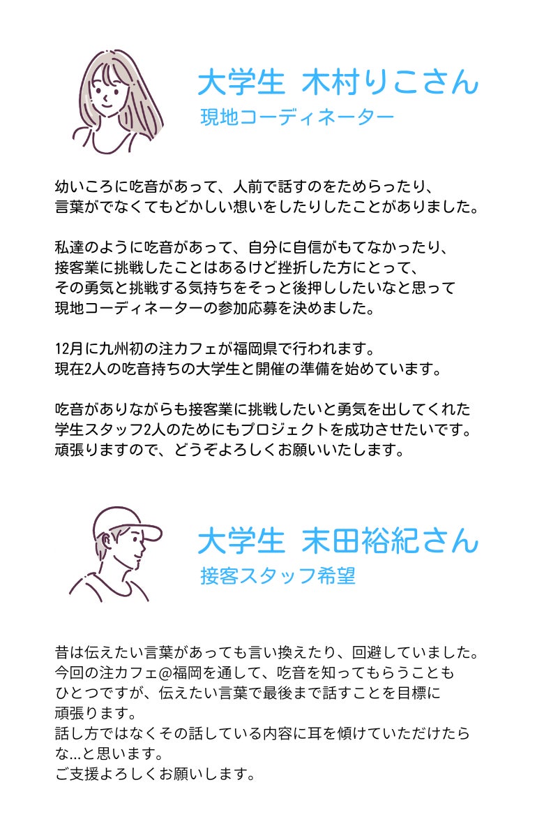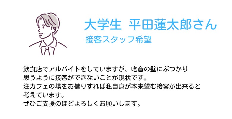 吃音を抱えながらも接客業に挑戦したいと願う若者たちが夢を叶えてもらうために、また吃音のある若者たちと交流することで、今まで吃音が身近ではなかった方々にも理解を広げることができます。