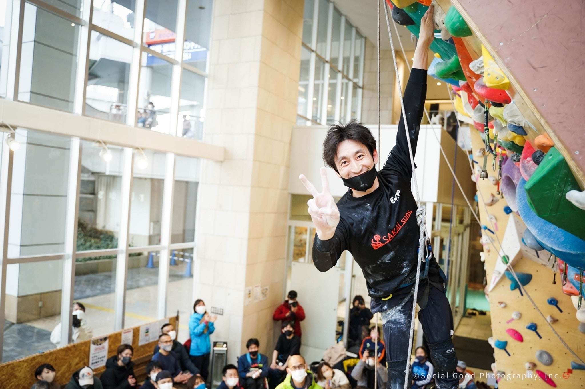 視覚障害のパラクライミング世界1位の小林幸一郎(NPO法人モンキーマジック)を招待して、小学生にアイマスクをしてもらいクライミングするイベントを企画しました。その時、小林さんに「足が動かないボクも体験できますか?」と尋ねた時、「もちろんできるよ!」と言っていただき、少し登れたことがキッカケではじめました。