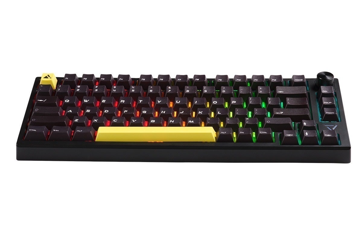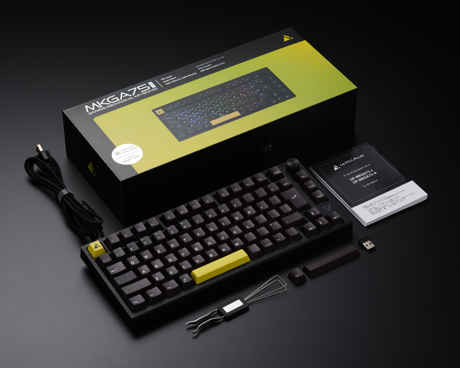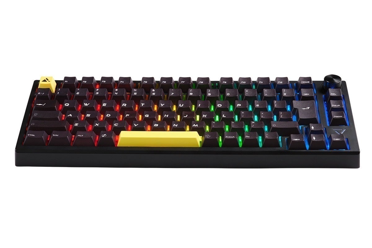 ソフトウェアで光り方のパターンが楽しめるRGB LEDライトに加え、音量調節可能な高級感のあるアルミ削り出しのノブを装備。ESCとスペースキーは黒色のキーキャップへも交換可能(付属品)、主張が控えめのブラック一色にすることもでき、ゲーム部屋やオフィスなど、様々な環境で使用できる外観です。