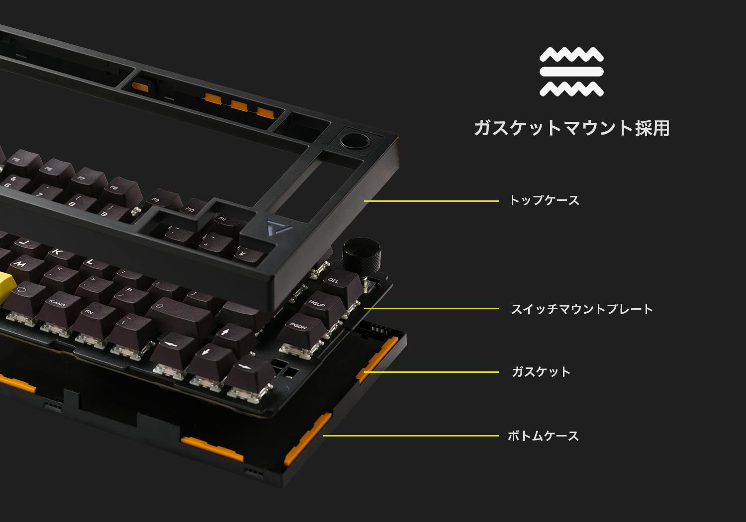 キースイッチを保持するプレートを柔軟性のある素材で挟み込むことで、心地よい打鍵感と静粛性に優れた構造を実現。 内部の空間にもフォームを使用し、打鍵時に余計な音が反響しないよう配慮をしています。