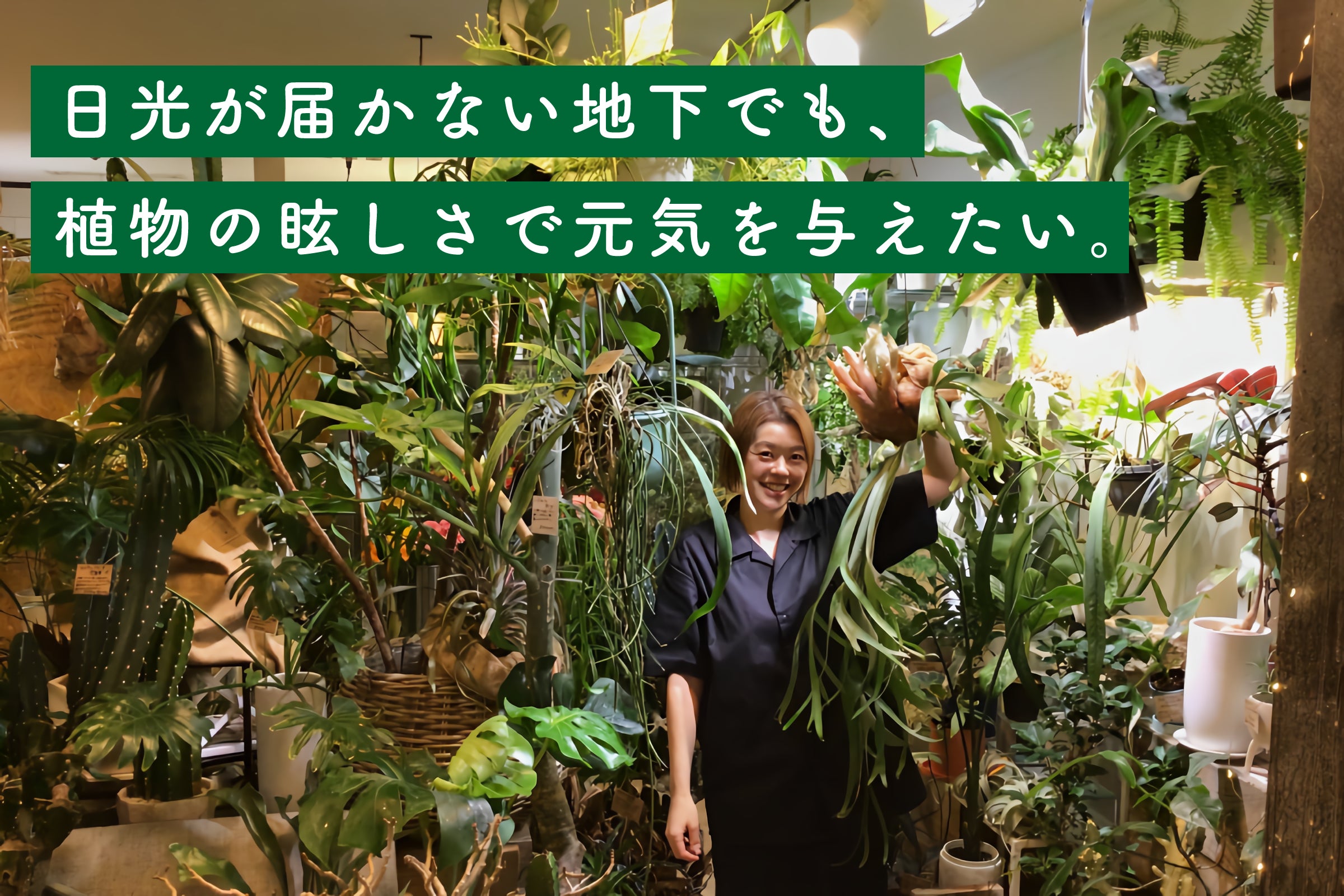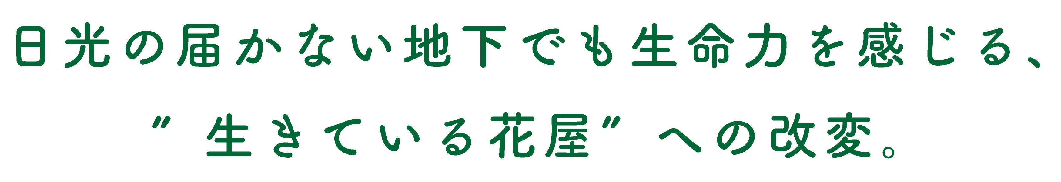 オフィスビルの中にある花屋だからこそ、より一層強く感じられる植物の自然な生命力。当初はデメリットに感じていた「地下」という環境でしたが、今では、敢えてこの場所から皆様に伝えることで届くものがあると思っています。植物を通してお客様とコミニュケーションをとれる身近な場となれるよう、これからも今のお店に植物たちと一緒に立ち続けたいと心から思います。