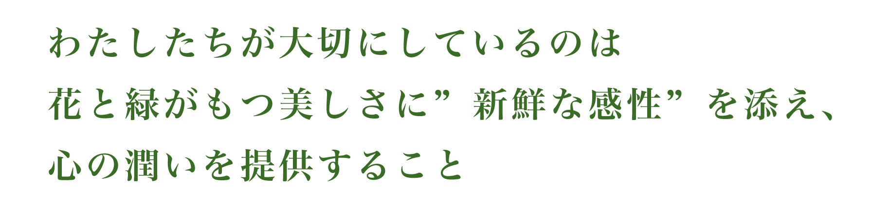 総合フローリストとして経験と実績を積み上げること60余年。そして現在も、私たちは設立当初から変わらない想いを胸に、小売店舗はもちろん、ブライダル装花や商業施設などのシーズンディスプレイ、レンタルグリーンから造園施工管理まで、花と緑を通じた多彩な提案を続けています。オリジナル資材の企画考案や海外からの輸入販売なども展開。独自のネットワークを駆使した仕入れが、お客様の多様なニーズに対応するトータルな企画・デザインを可能にしています。自然からの贈り物に常にフレッシュな感性をプラスすることで、多くの人や社会に潤いと豊かさをもたらす花と緑の提案を追求します。