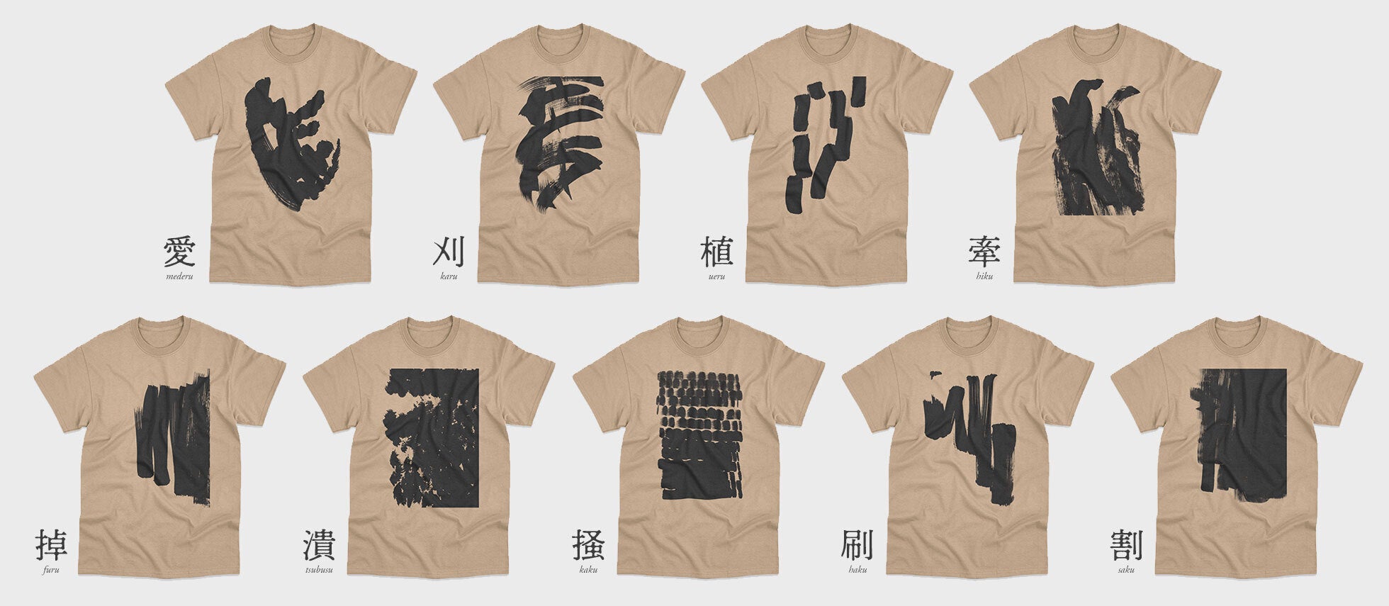 割(さく)、刷(はく)、搔(かく)、潰(つぶす)、掉(ふる)、牽(ひく)、植(うえる)、刈(かる)、愛(めでる)、今回はこれら9種をイメージして筆で制作。この動作の線は色々な形で表現できるなとテラダヒデジ氏が思いつきデザインしました。