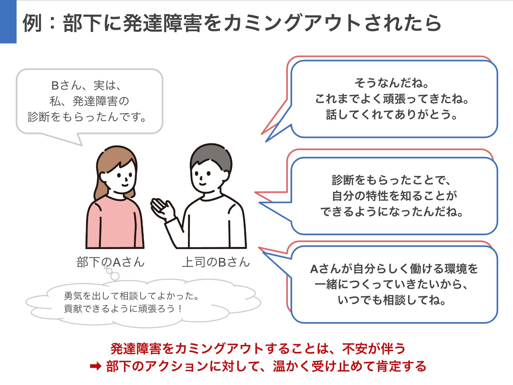 また、発達障害の当事者の困りごとは、そのほかの多くの方と地続きです。だからこそ、このアプローチは、一部の人のためのものはなく、職場にいる多くの人の笑顔に繋がる取り組みなのです。