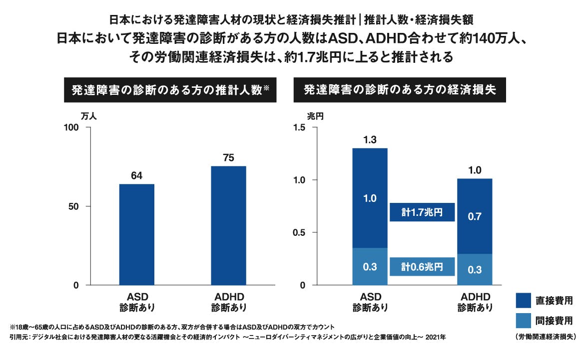 『発達障害人材を十分に活用できていないことによる、日本の経済損失額は年間2兆3000億円。そのうち約1兆7000億円は(中略)労働関連の経済損失。十分なサポート制度があった場合、発達障害者は一般平均よりも生産性が高くなる傾向がうかがえた。』