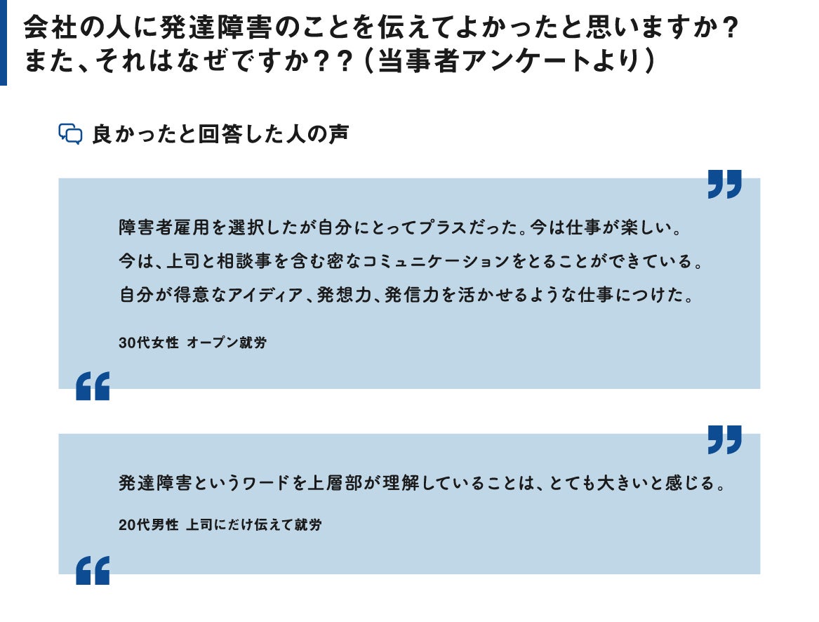 このアンケートのコメントを読むと、当事者は企業に対して特別扱いを求めている訳ではないことがわかると思います。当事者は、ただ、発達障害への正しい理解を求めています。「理解する」ことだけでも大きな一歩です。mojoは「当事者がどんな理解を求めているのか」を、わかりやすく伝えていきます。
