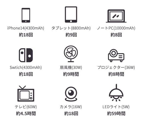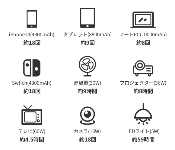 日常の使用からキャンプ、車中泊、アウトドア、車の常備、災害時の充電など様々な場面で活躍できます。