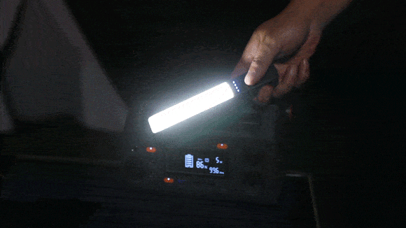 約1000ルーメンと高い輝度のLEDライトが本体の上方に付き、キャンプなどで大活躍します。また、取り外せるデザインなので、災害時に本体から取り外して、小型懐中電灯としても使用可能です。