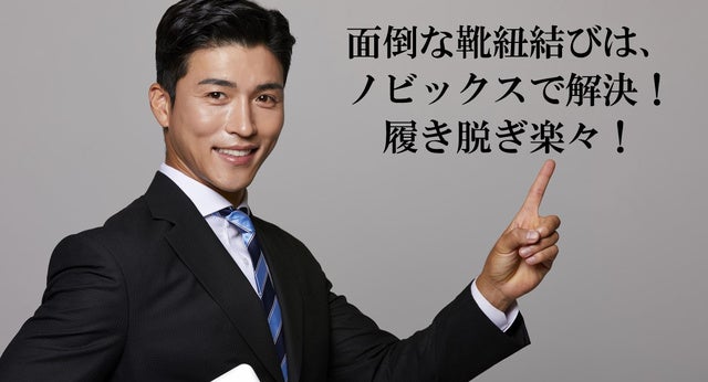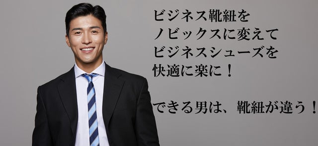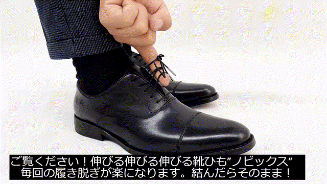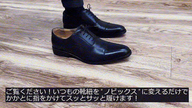 ご覧ください!ビジネスシューズのかかとに指を入れ、かかとをスッ!と靴に滑り込ませ、パッ!とスッと履くことが出来ます!元々ついている既存のビジネスシーズの靴ひもから【ノビックス】に変更して履いてます。