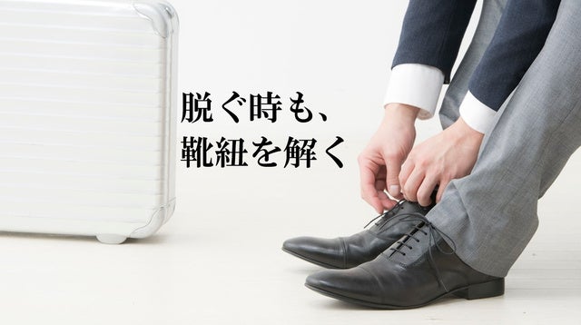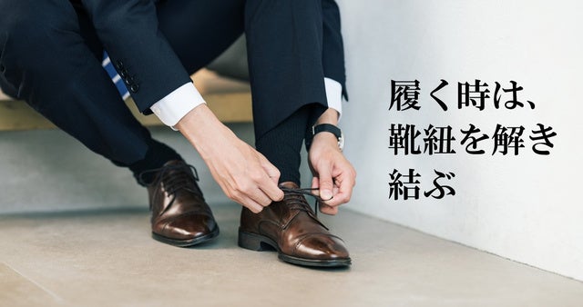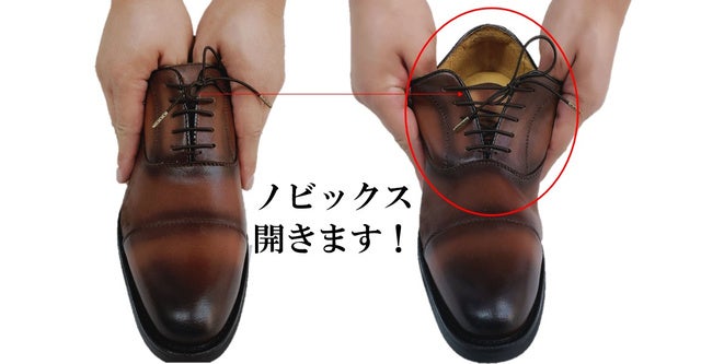 ビジネスシューズの見た目は変わらない、手をかかとにかけるだけで簡単に履き脱ぎできたらどうでしょうか?ご覧ください。履き口、靴の羽根部分が大きく開いてます。伸縮性のビジネスシューズ靴紐ノビックスは、今までの煩わしさから解放します。サッと履けて、スッと脱ぐことができます。紐はきれいに結ばれたままの外観。
