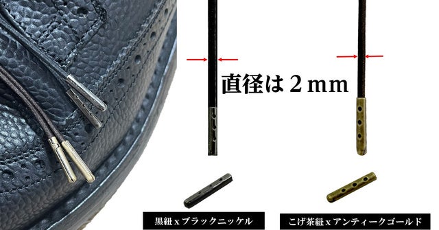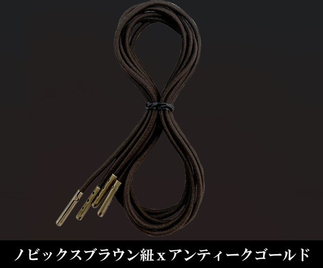 ノビックスは先端にもこだわってます。黒紐にはブラックニッケル、こげ茶にはアンティークゴールドのアグレット(先端のカバー)を装着しております。先端ほつれ、ほどけ防止だけでなく、まず見た目に高級感があります。ビジネス上、華美、派手にならないんように落ち着いたトーンのアグレットカラーでまとめてあります。