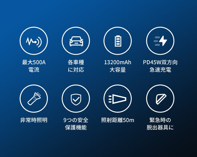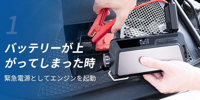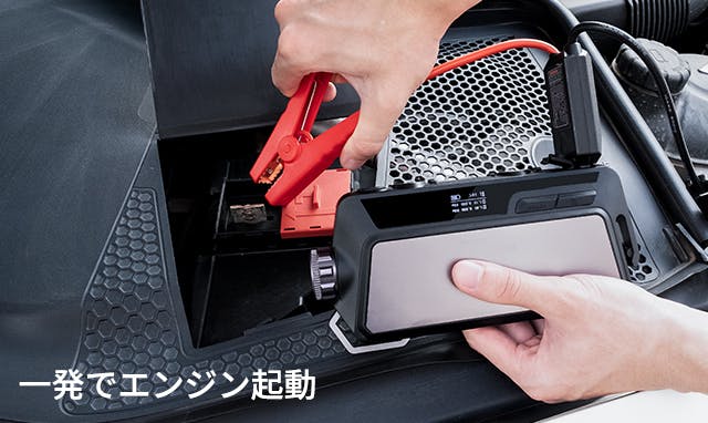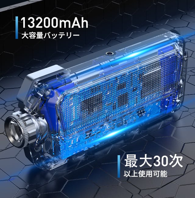 内蔵バッテリーは13200mAhの大容量ですので、フル充電で最大30回エンジンを起動可能です。長期間車に積んでおいて、いつでもお使いいただけます。