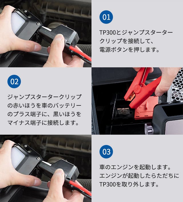 ジャンプスターターの接続は、慣れないと不安なものです。TP300なら、このような心配はいりません。3つのステップで、初めての方も簡単に使用できます。