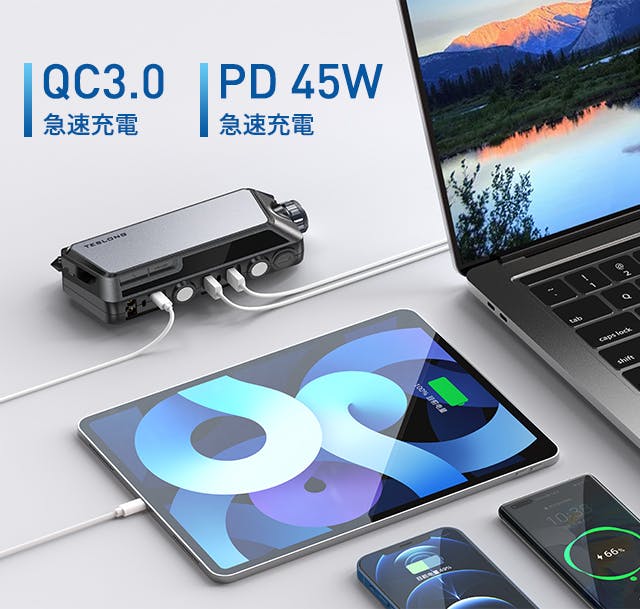 TP300はType-Cポート1口とUSBポート2口を搭載しています。USBポートはQC3.0急速充電を、Type-CポートはPD 45W双方向急速充電をサポートしていますので、ノートPCとタブレット、スマホの2台を同時に充電できます。