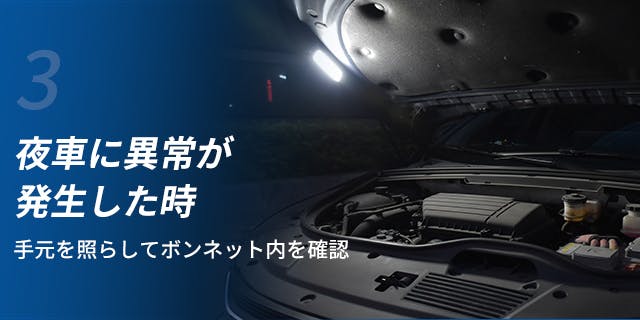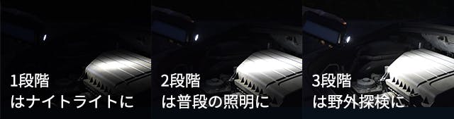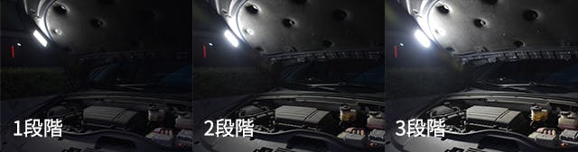 TP300は背面にLEDライトを装備しています。明るさは3段階に切り換えられ、フル充電時は24時間以上連続使用可能です。夜車に異常が発生してボンネット内のエンジンを確認したい時、キャンプで照明が必要な時などに便利です。