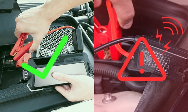 ジャンプスタータークリップのプラスとマイナスを逆に接続してしまった時は、指示灯が赤く点滅して警告音を発します。正常に接続できた時は、指示灯が緑で点灯します。