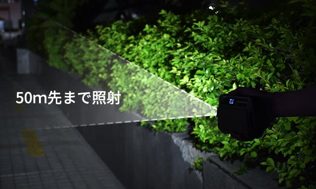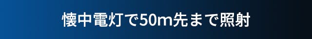 懐中電灯も装備しており、50m先まで照らすことが可能です。夜でも足元や周辺を先々まで確認できます。
