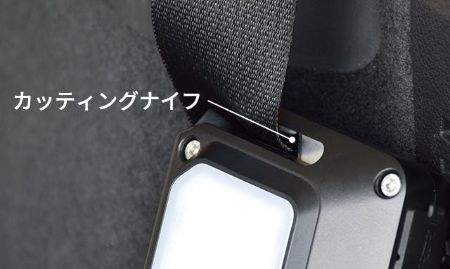 また、シートベルトカッターも付いておりますので、万が一の場合にシートベルトを切って脱出できます。