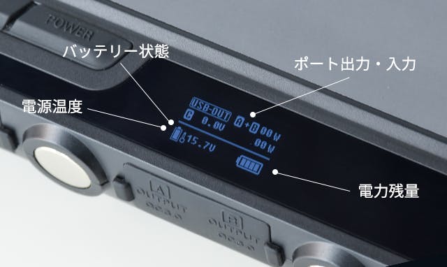 LEDディスプレイで現在の電力残量や電源温度、ポート出力など、重要な数値を一目で確認できます。