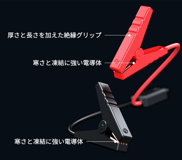 錫メッキ銅製のジャンプスタータークリップは、逆接続防止機能を備えており、プラスとマイナスを逆に接続してしまった場合、自動で識別して警告音を発します。
