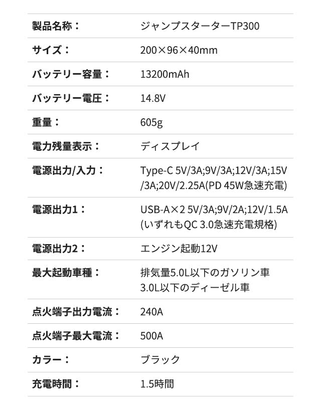 4つのバッテリーセルでパワフルな性能を実現したTP300は、排気量の多い車種にもお使いいただけます。排気量5.0L以下の12Vガソリン車、3.0L以下の12Vディーゼル車にも使用可能です。