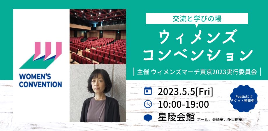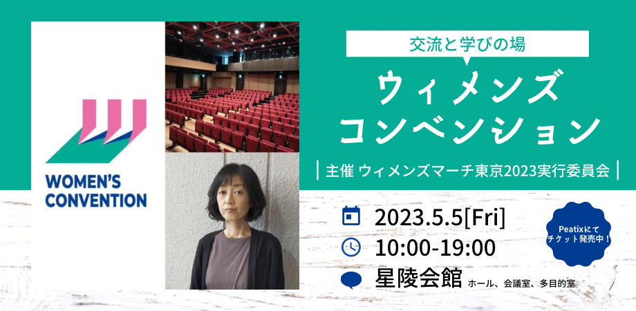 2023/04/13 13:02こんにちは、ウィメンズマーチ東京2023実行委員会です!この度、5月5日(金・休)開催の「ウィメンズコンベンション」について、プログラムが決定し、チケットの販売を開始しました。マーチをきっかけにジェンダー平等やフェミニズムに関心を持った人たちと、これまでフェミニズム視点から社会課題の解決に取り組んできた人たちが、交流し、学び合い、これからのフェミニズム運動を共につくっていくためのイベントです。多様な参加者を歓迎いたします。ぜひご参加ください!クラウドファンディングで1万円以上のご支援をいただいた皆様には無料招待についてメールをお送りしていますので、ご確認をお願いいたします。チケットはこちら(Peatix)からご購入いただけます。当日の詳細は以下にご紹介します。<ウィメンズコンベンション>日時:2023年5月5日(金・休)10:00~19:00会場:星陵会館(東京都千代田区永田町2-16-2、アクセス)※会場までの道に坂があります。お手伝いが必要な方は下記お問い合わせまでご連絡ください。プログラム:1)オープニング 10:00~10:50 @ホール ・主催者挨拶&イベントの趣旨説明:ウィメンズマーチ東京2023実行委員会 ・ミニコンサート:UG(歌)、リン・ヘイテツ(ピアノ) ・各ワークショップの紹介 等2)ワークショップ(午前の部) 11:00~12:30 @会議室(1D~4AB)・「#GGVA エンパワメントーク特別版~私のなかのアンコンシャス・バイアス~」(GG Voice & Action)・「わたしのからだ わたしのものー経口中絶薬と堕胎罪・母体保護法(仮)」(SOSHIREN女(わたし)のからだから)・「“わたし”が安心して“わたし”でいられるために」(グリーフサポートせたがや)・「ウィメンズマーチ東京のつくり方」(ウィメンズマーチ東京2023実行委員会)・「演劇『ミモザウェイズ1910-2020』朗読ワークショップ」(日仏女性の人権架け橋 ミモザ実行委員会)(※各ワークショップの詳細はこちらからご覧いただけます。)3)ランチ休憩 12:30~13:304)基調講演 13:30~14:15 @ホール「99%のためのフェミニズム運動を創造する」 菊地夏野さん 5)パネルディスカッション 14:15~15:30 @ホール「99%のためのフェミニズムに必要なもの」 パネリスト:林貞和さん、菊地夏野さん、藤原久美子さん、堀江有里さん6)休憩 15:30~15:457)ワークショップ(午後の部)15:45~17:15 @会議室 (1D~4AB)・「性的同意ハンドブックを用いた、第三者介入の実践ワーク」(早稲田大学性的同意ハンドブックチーム)・「自分を語る言葉を紡ごう、見つけよう~性の語り、一緒に模索しませんか~」(性のワークショップ・あも会)・「モヤモヤを文字にしてZINEを作ろう」(Alliance YouToo)・「移民女性のリプロダクティブ・ヘルス・ライツを考える:技能実習生の妊娠・出産問題から」(NPO法人移住者と連帯する全国ネットワーク)・「フェミ映画上映会」(ウィメンズマーチ東京2023実行委員会) ・「<わたしにもできる>ジェンダー平等の実現~女性差別撤廃条約の選択議定書批准へ」(女性差別撤廃条約実現アクション東京(OP-CEDAW ACTION東京))(※各ワークショップの詳細はこちらからご覧いただけます。)8)休憩 17:15~17:309)エンディング交流会 17:30~19:00 @多目的室(※軽食付き。エンディング交流会への参加費は別途1,000円です。参加される方はエンディング交流会参加費が含まれるチケットをご購入ください。)・参加者同士の交流会、ワークショップの成果報告 等参加チケット種類:①コンベンション参加チケット 1,000円②コンベンション+エンディング交流会参加チケット 2,000円参加方法:以下のサイトよりチケットをご購入ください。▼参加チケット販売(Peatix)https://womensconvention2023.peatix.com/主催 ウィメンズマーチ東京2023実行委員会<イベント参加にあたって>・途中参加・退出自由です。ただし、チケット代は返金できません。・本イベントは対面での開催とし、オンライン配信等は行わない予定です。・障害等により参加にあたってサポートが必要な方は、実行委員会まで希望するサポート方法をお知らせください。予算や人員の関係でご希望に添えないことがありますが、その場合は事前にご相談いたします。オープニング、基調講演、パネルディスカッションについては手話通訳及び要約通訳をお願いする予定です。・小学生以下の子どもは参加費無料です。保護者の方はすべてのプログラムにお子様と一緒に参加いただくことが可能です。予算の関係で有料の託児は準備できませんが、ボランティアや他の参加者と協力し保護者およびお子様の参加をサポートします。お子様と参加される場合は事前にご連絡いただければ、利用していただける休憩室等をご案内します。・ウィメンズコンベンションへは多様な参加者を歓迎します。特定の属性やバックグラウンドを持つ集団・個人を差別・排除するような言動は認めません。そのような言動がある場合は参加をお断りすることがあります。・多様な参加者が安心して参加できるイベント運営にご理解とご協力をお願いいたします。※コンベンションの詳細はウィメンズマーチ東京H