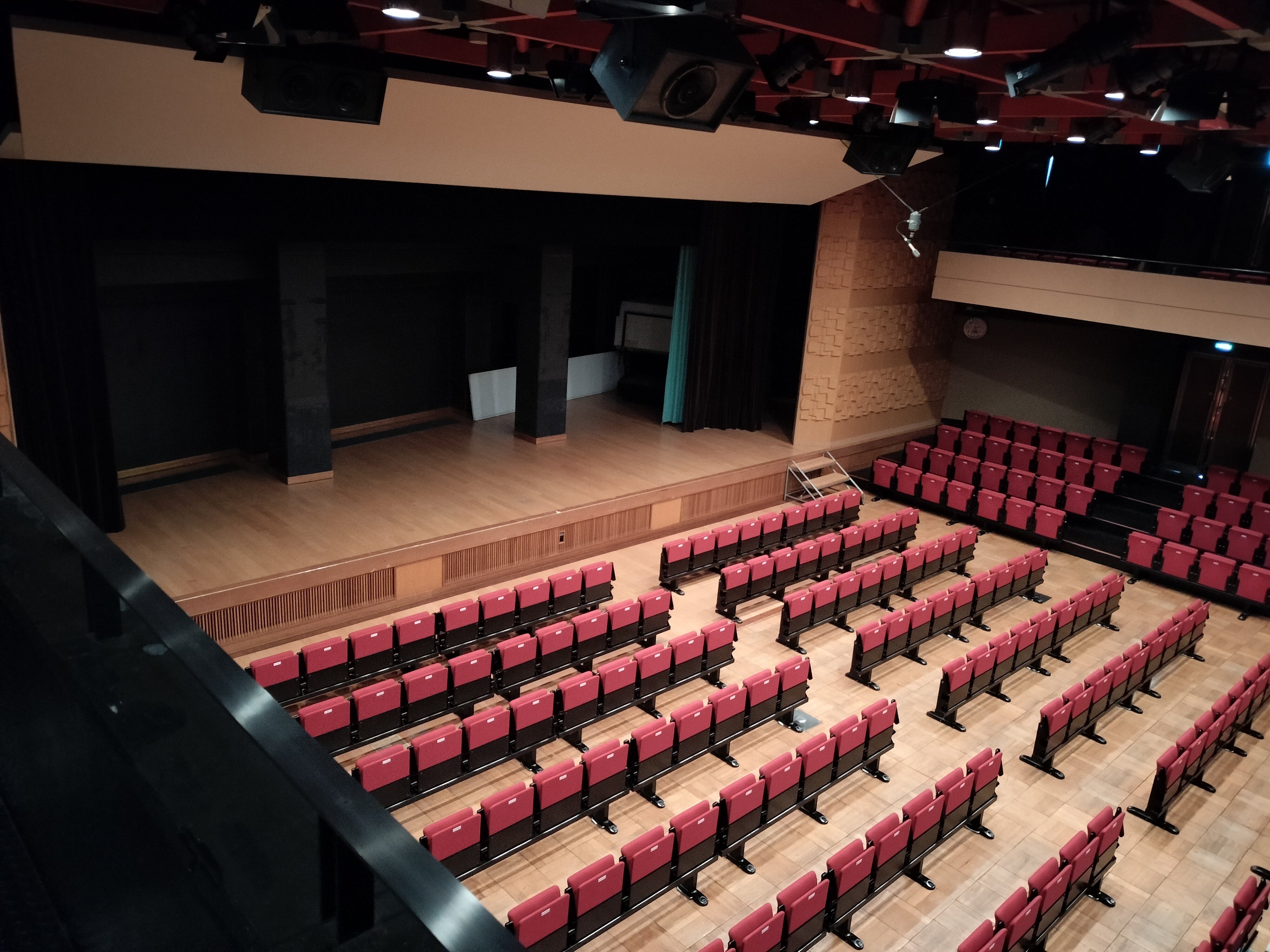 赤いシートが素敵なこのホールは、コンサート用ではないものの、いろいろな工夫をして皆さんに楽しんでいただけるようにしたいと思っていますので、ぜひ楽しみにしていてください。