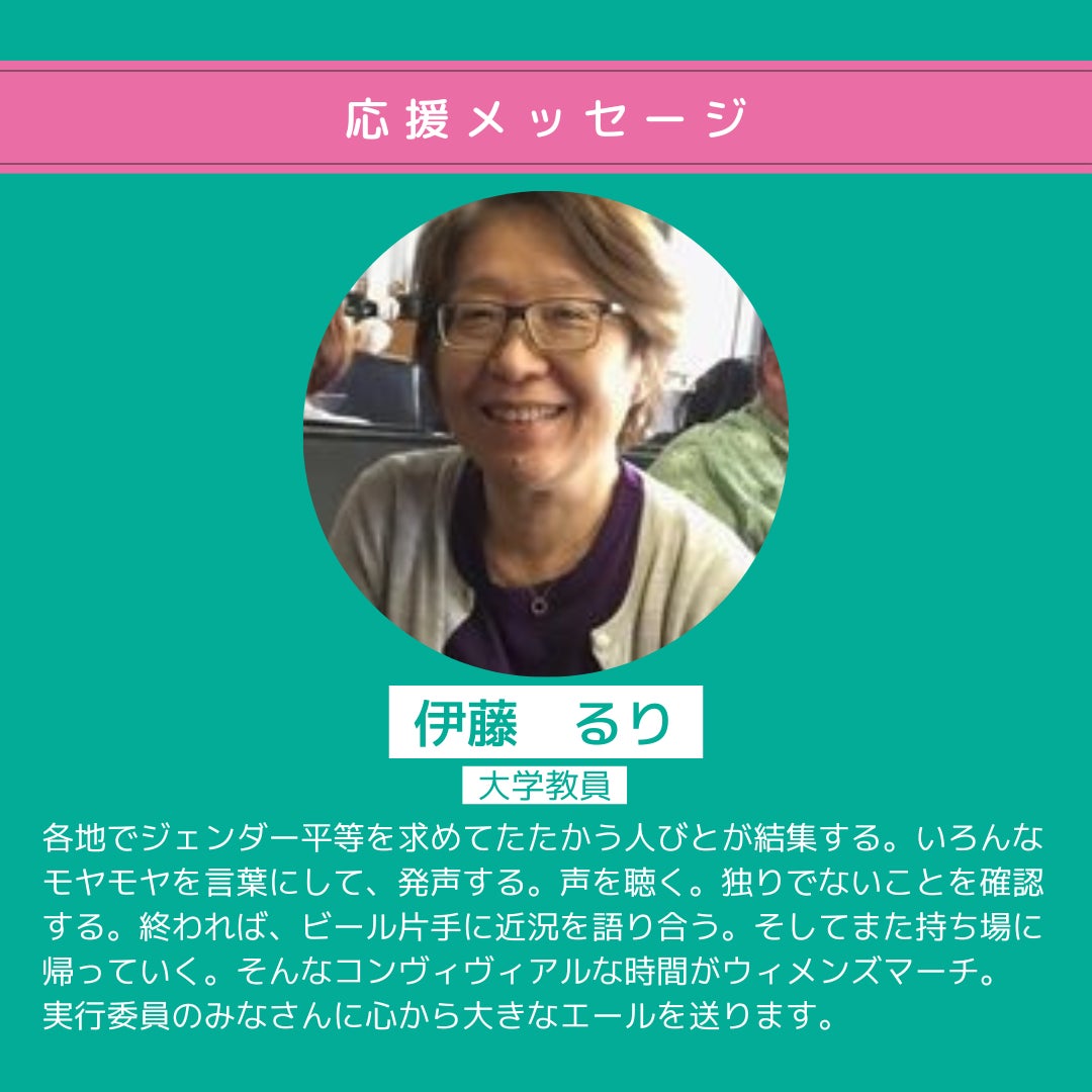 各地でジェンダー平等を求めてたたかう人びとが結集する。いろんなモヤモヤを言葉にして、発声する。声を聴く。独りでないことを確認する。終われば、ビール片手に近況を語り合う。そしてまた持ち場に帰っていく。そんなコンヴィヴィアルな時間がウィメンズマーチ。実行委員のみなさんに心から大きなエールを送ります。 伊藤るり(大学教員)