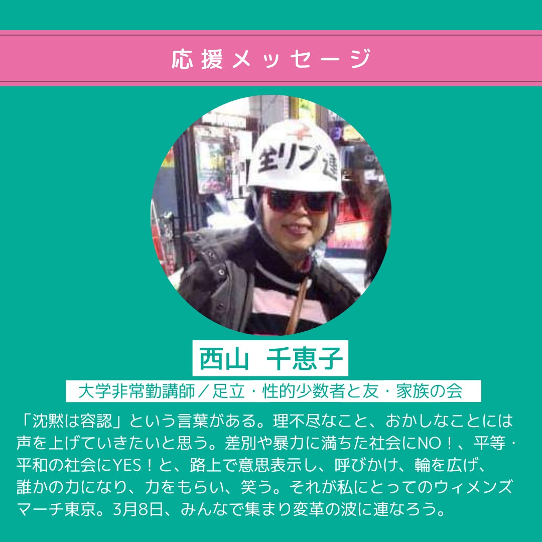 「沈黙は容認」という言葉がある。理不尽なこと、おかしなことには声を上げていきたいと思う。差別や暴力に満ちた社会にNO!、平等・平和の社会にYES!と、路上で意思表示し、呼びかけ、輪を広げ、誰かの力になり、力をもらい、笑う。それが私にとってのウィメンズマーチ東京。3月8日、みんなで集まり変革の波に連なろう。