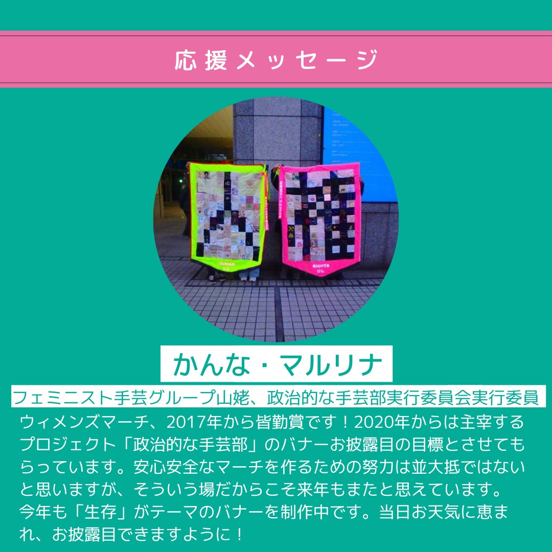 フェミニスト手芸グループ山姥、政治的な手芸部実行委員会実行委員のかんなさんとマルリナさんから応援メッセージをいただきました!