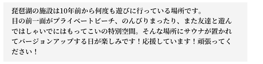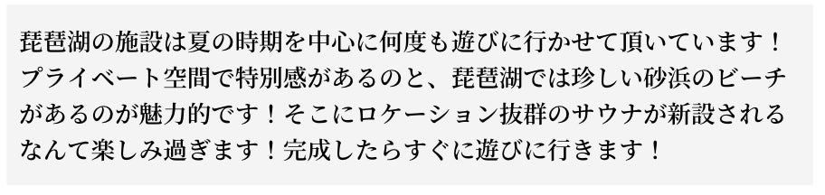 琵琶湖に宿泊も含め、1年中アクティビティを楽しめる場所を作りたいと思っています。今回のチャレンジはまずはサウナ事業。サウナを選んだ理由は、1年中楽しめるようにする為です。