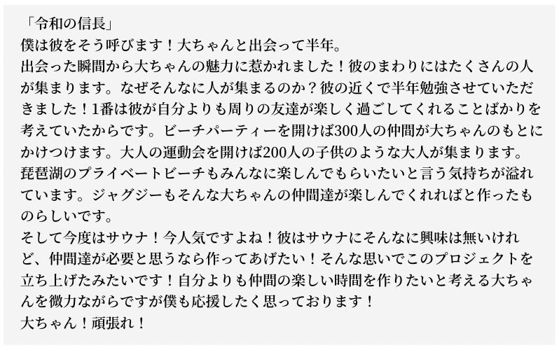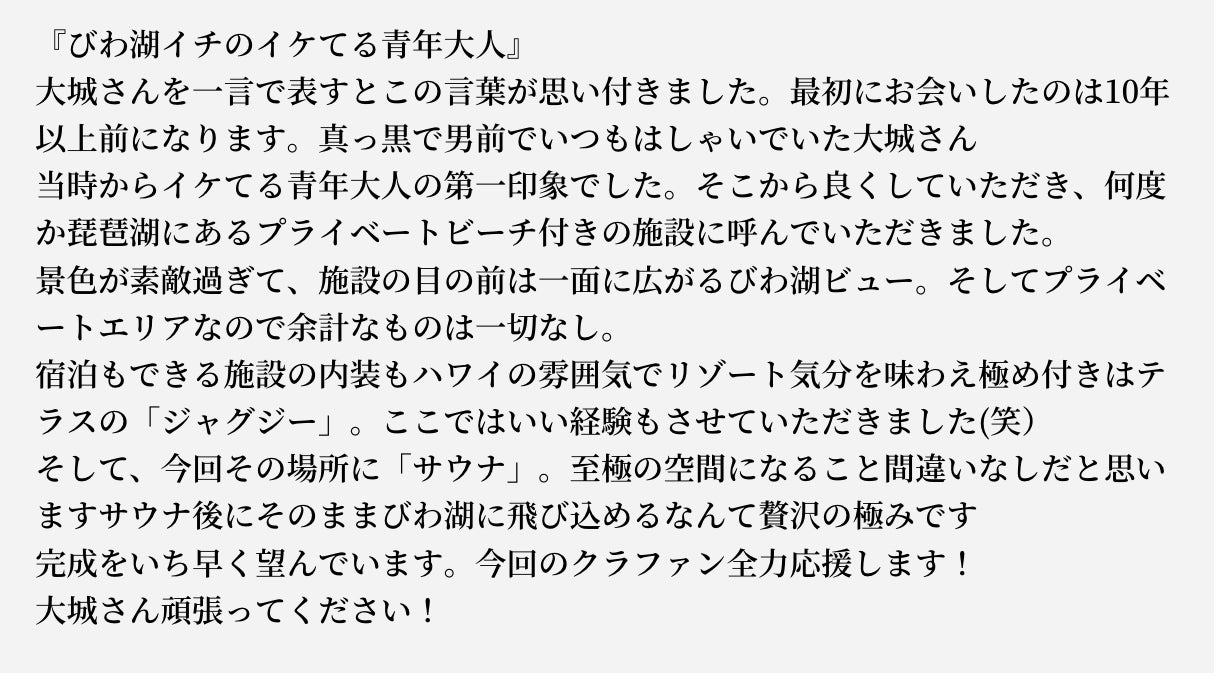 琵琶湖に色んな施設を作って、よりたくさんのお友達が楽しんでもらえたらと考え、クラウドファンディングで資金を集めることにしました。そんな第一歩にご協力頂きたく思っております。