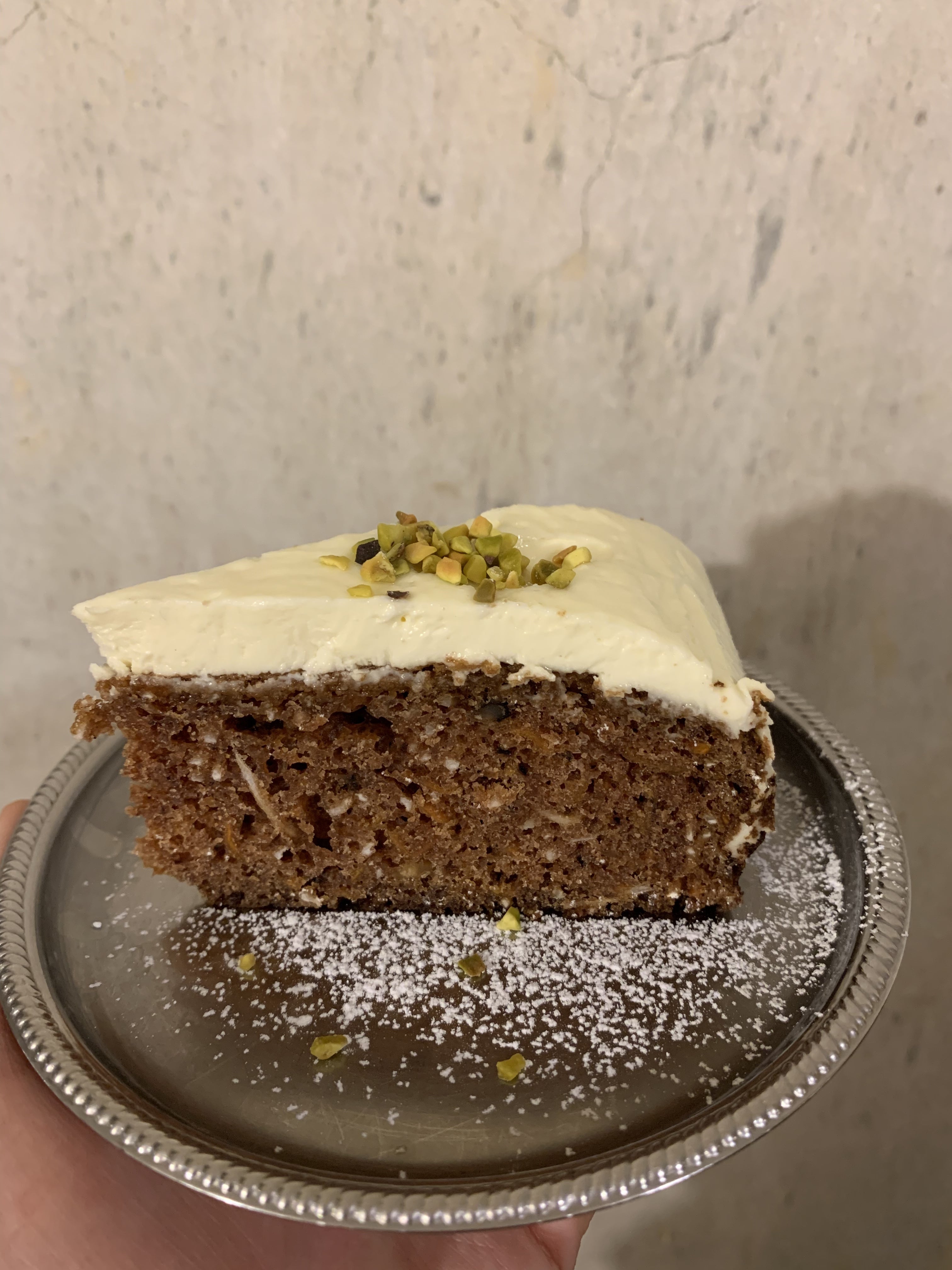 しっとりした生地感にココナッツやミックスナッツ、スパイスはシナモンとナツメグを混ぜ込んでいます。フロスティングはマスカルポーネクリチでクリーミィ。