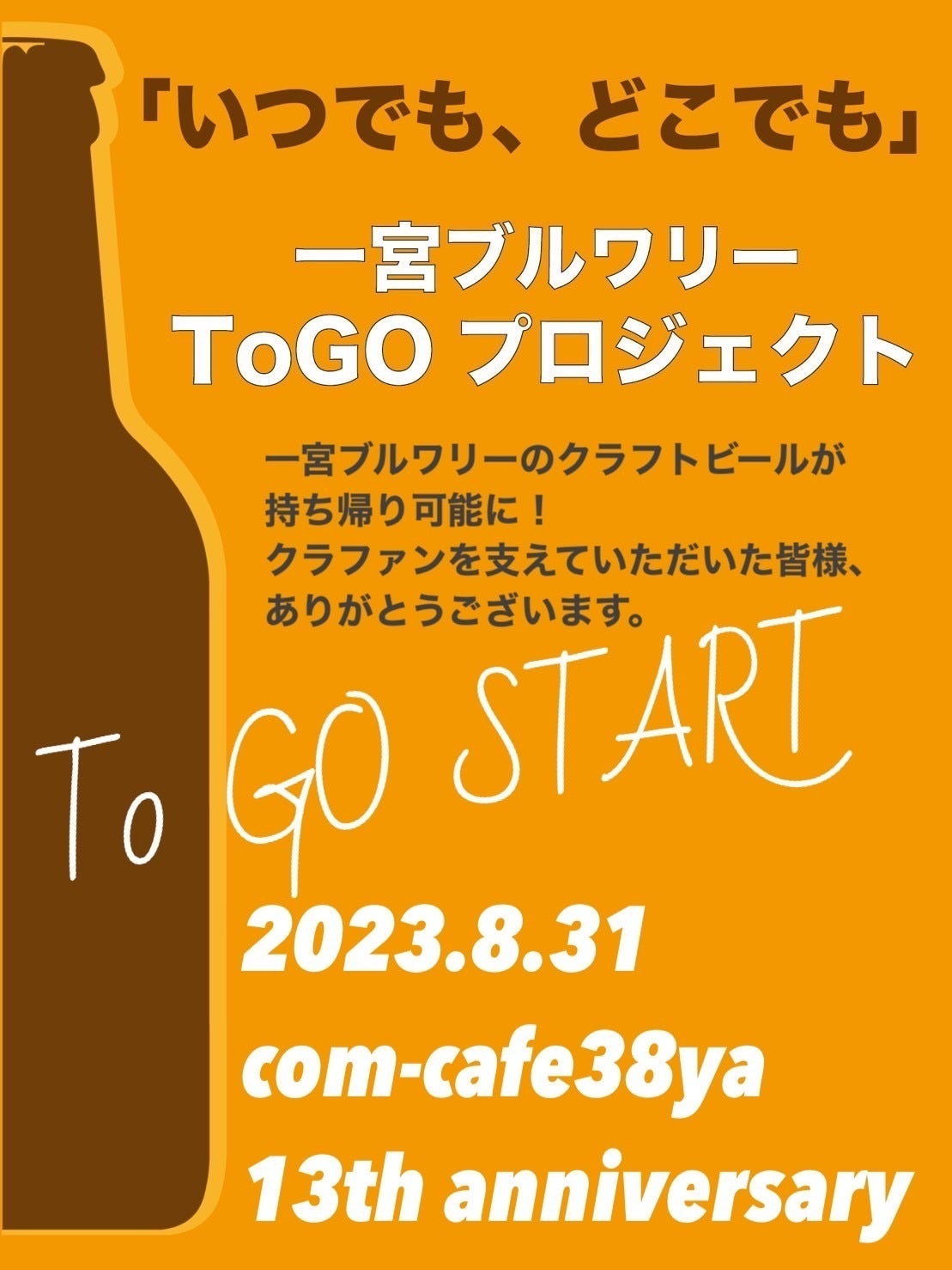2023/08/31 07:00一宮ブルワリー To GO STARTanniversary com-cafe 38ya 13th 2023.8.31com-cafe三八屋はこの夏13周年を迎えます。1月18日にスタートし3月8日に目標金額を大きく上回り達成した一宮ブルワリー To GOプロジェクト。クラウドファンディングを支えていただいた皆様、ありがとうございました。そして・・・大変長らくおまたせしました!準備が出来ましたのでこの記念日より念願の持ち帰りをスタートします。ぜひ、「いつでも、どこでも」一宮ブルワリーのクラフトビールをお楽しみください。持ち帰りスタートは、” ゴールデンエール ” です。ペットボトルにて持ち帰り。限定38本価格 1本 830円(税込)持ち帰りはご予約にてたまわります(tel.0586-27-4838)SNS、FBメッセンジャー、InstagramDMからもご予約できます。 もっと見るリターンお渡し中
