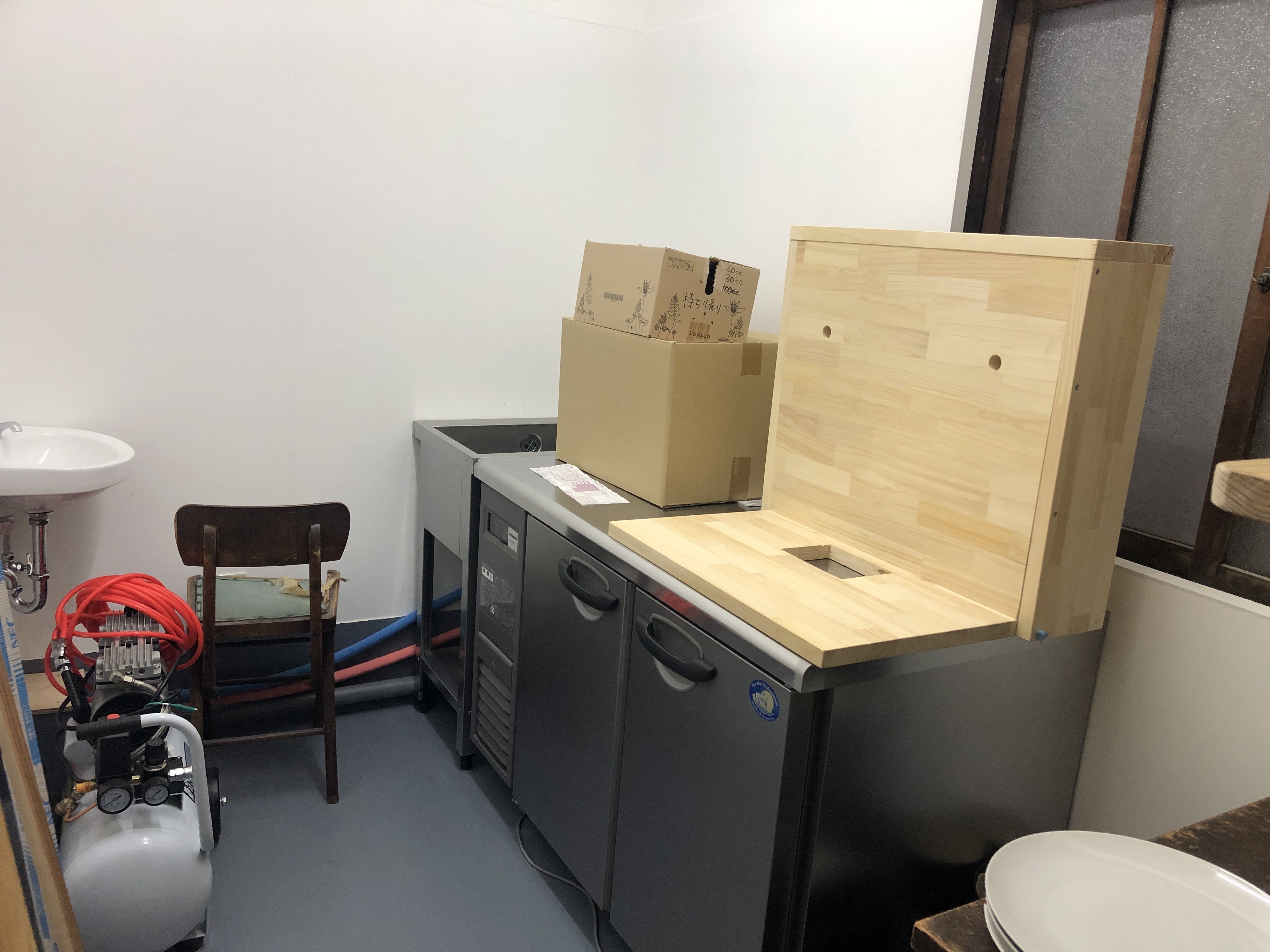 どことなく顔にも見える木製の什器など、少しづつ機材が入ってきました。