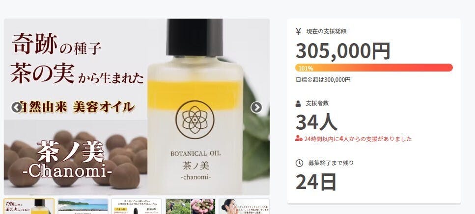 チャノキから手摘みしたお茶の実(左)の皮をむき(真ん中)、粉にして、その粉を機械にかけてオイルを搾っていきます。写真の通り、瓶1本から採れるオイルはわずか。とても稀少です。